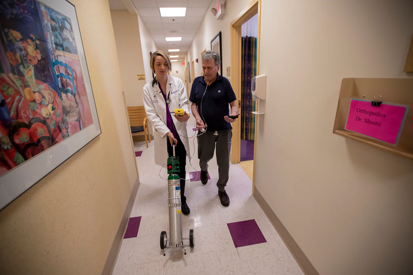 Howard reluctantly agreed to try using portable oxygen, resigned to wearing the clear plastic tubes looped over his ears and inserted into his nostrils. He assured Rice he has an air conditioner and will stay inside on extremely hot days. The doctor and patient agreed that Howard should take his walks in the evenings to be sure he gets enough exercise without overheating.