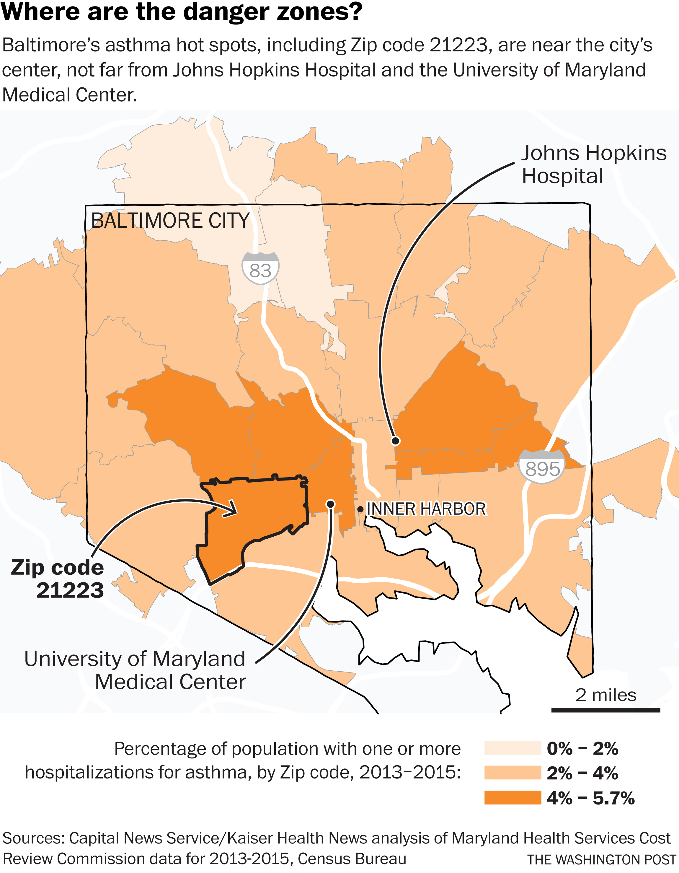 Baltimore paramedic crews make more asthma-related visits per capita in 21223 than anywhere else in the city, according to fire department records. It is the second-most-common ZIP code among patients hospitalized for asthma, which, when addressed properly, should never require emergency visits or hospitalization.