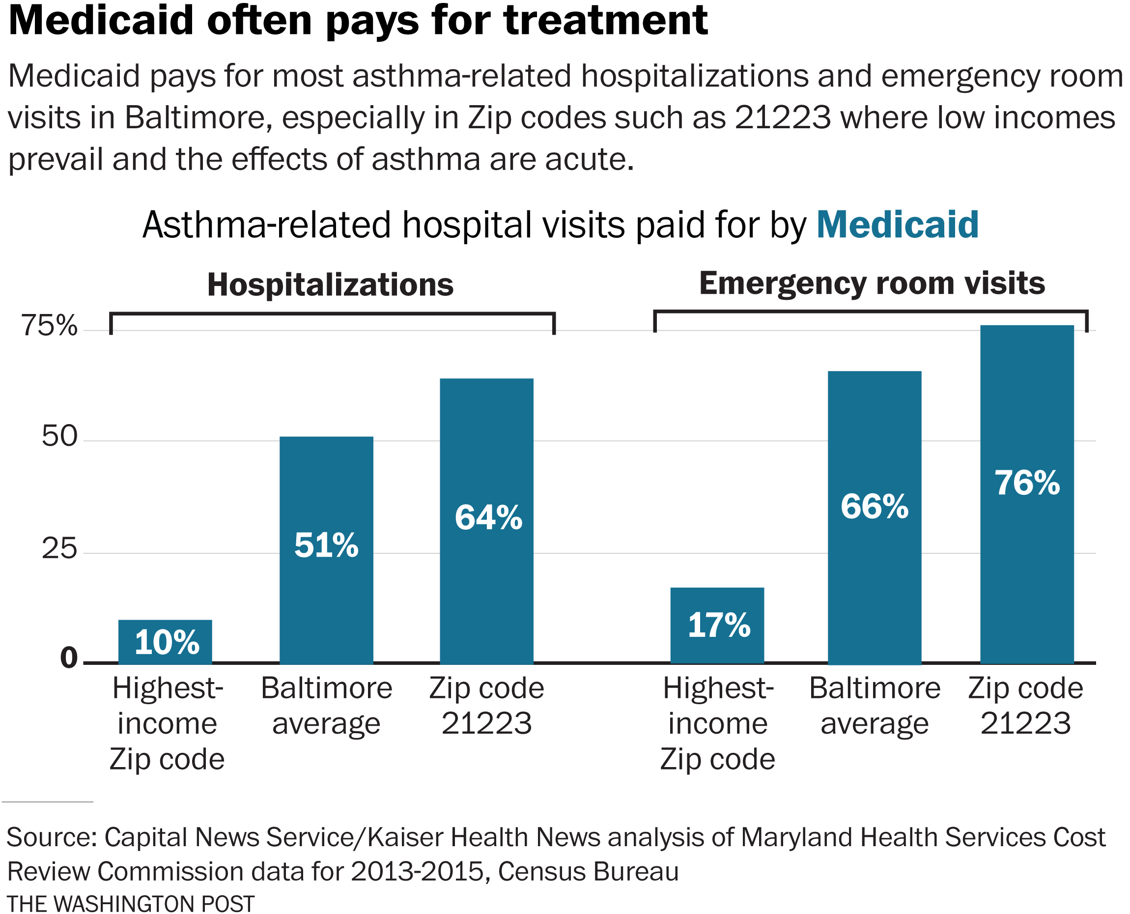 Residents of this area visit hospitals for asthma flare-ups at more than four times the rate of people from the city’s wealthier neighborhoods, according to data analyzed by Kaiser Health News and the University of Maryland’s Capital News Service.