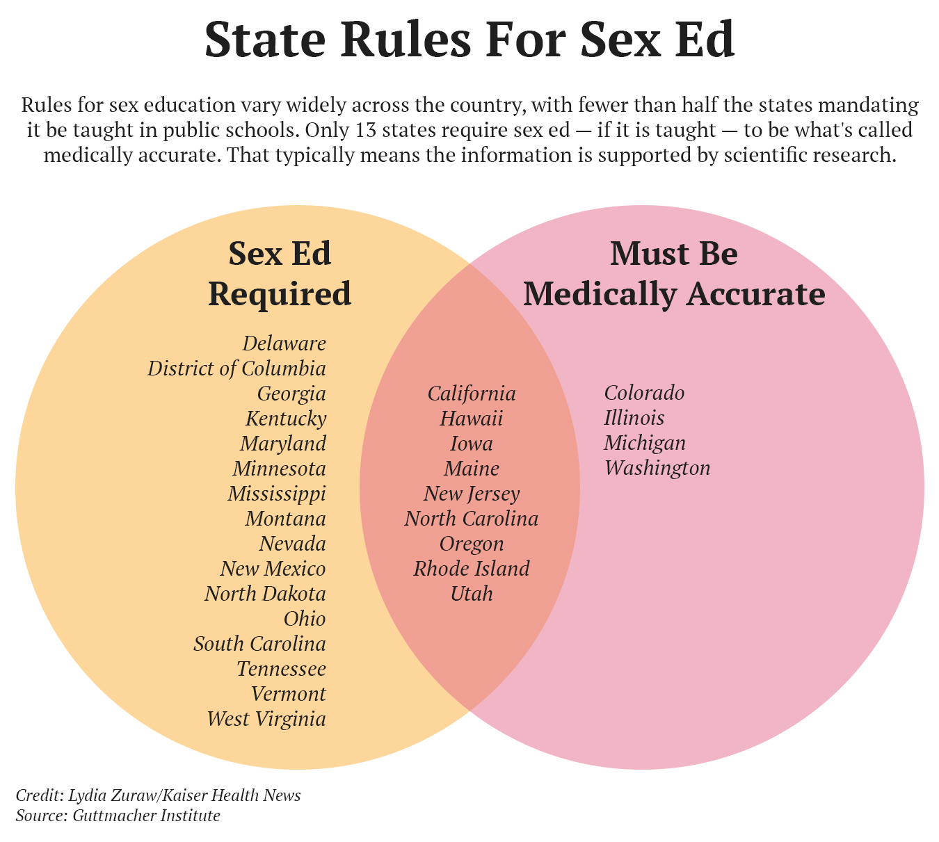 Decisions on such curriculum choices in public schools are largely determined by the states. Twenty-six states do not require sex education, according to the Guttmacher Institute, and only 13 require it to be medically accurate.