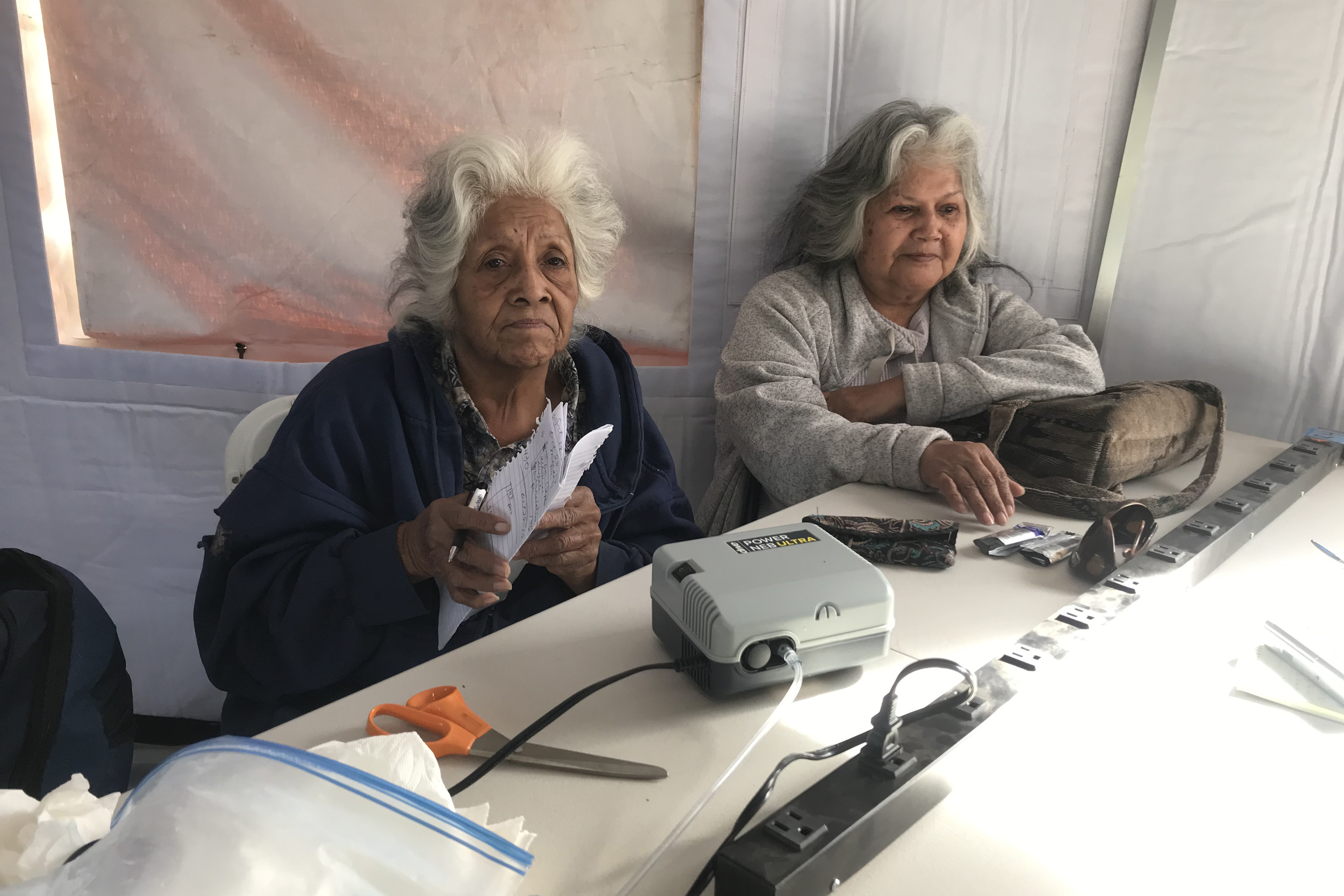 AUBURN, Calif. ― Fern Brown, 81, sat in the rear of a tent on the windswept fairgrounds of this historic Gold Rush town, drawing deep breaths through the mouthpiece of a nebulizer plugged into a power strip atop a plastic folding table.