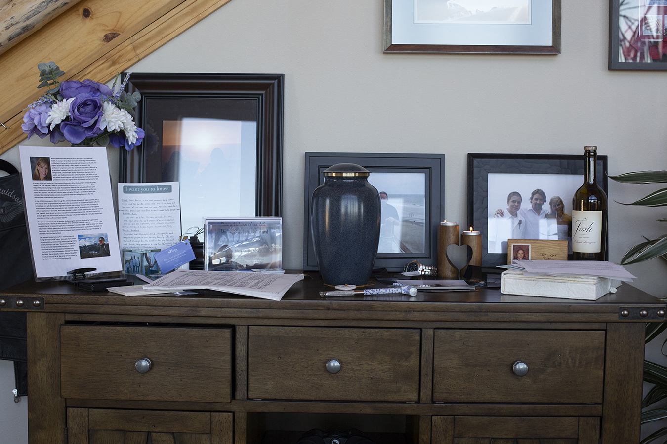 Stan Thomas placed photos and keepsakes around the urn containing the ashes of his wife, Monica Melkonian. (Tess Freeman for KHN)
