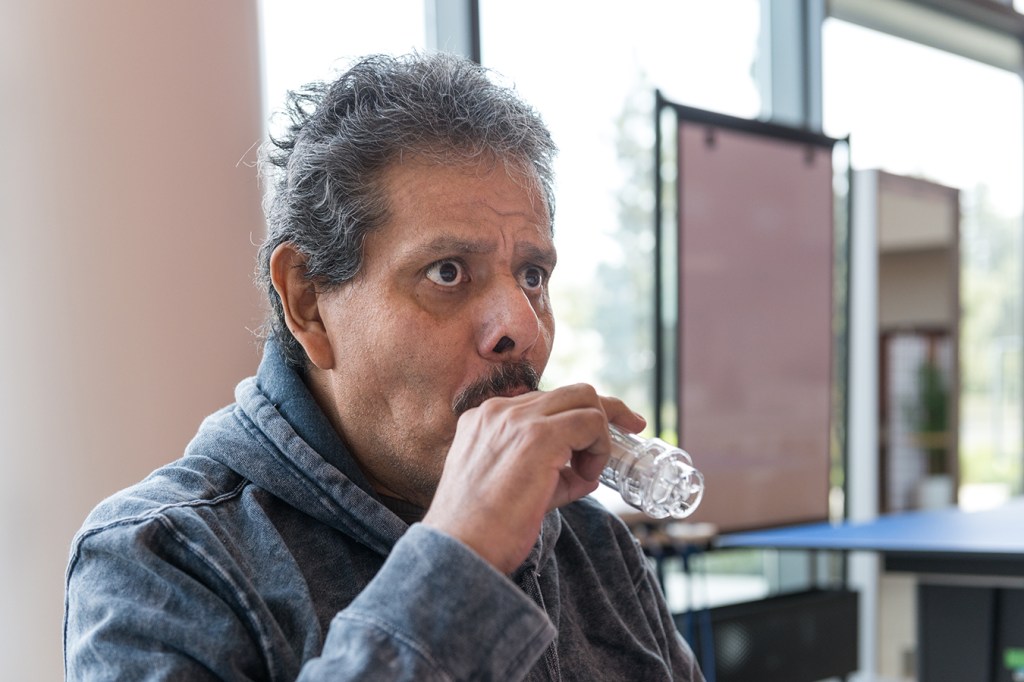 Because Perez was a cook at a hotel restaurant before he fell ill, his occupational therapy involves meal preparation. He stood at the sink, rinsing lettuce, carrots and cucumbers for a salad, then took them over to a table, where he sat down and chopped them with a sharp knife. His knife hand trembled perilously, so occupational therapist Brenda Covarrubias wrapped a weighted band around his wrist to steady him.