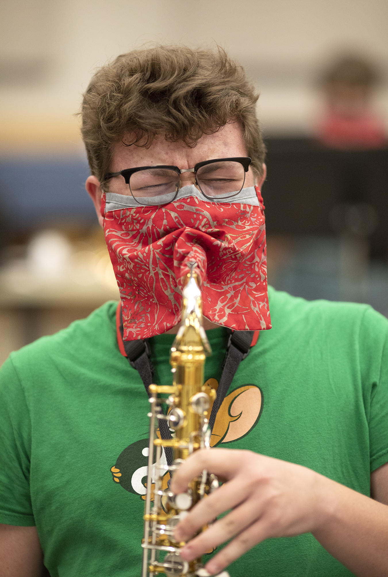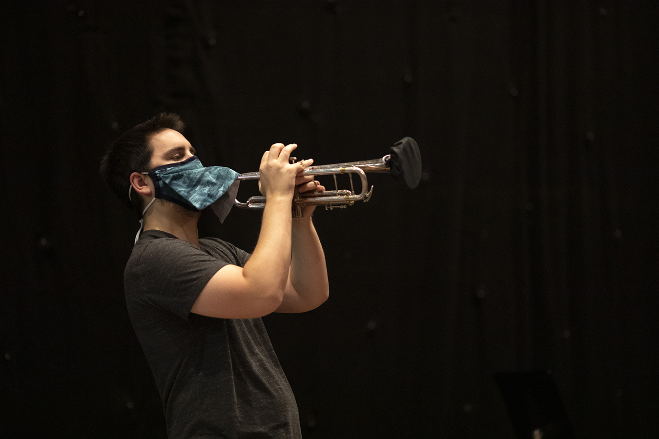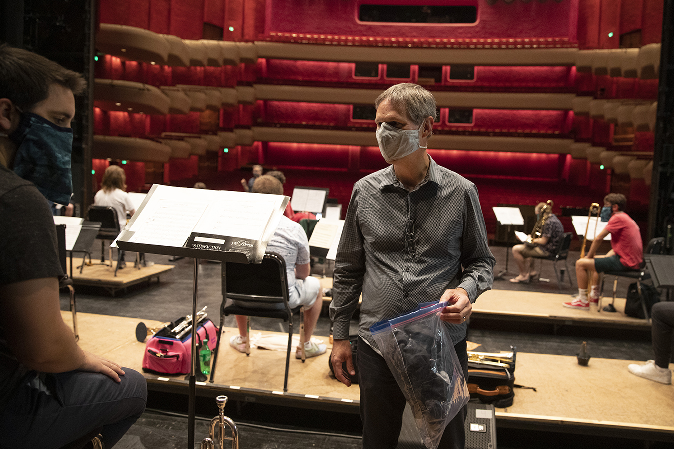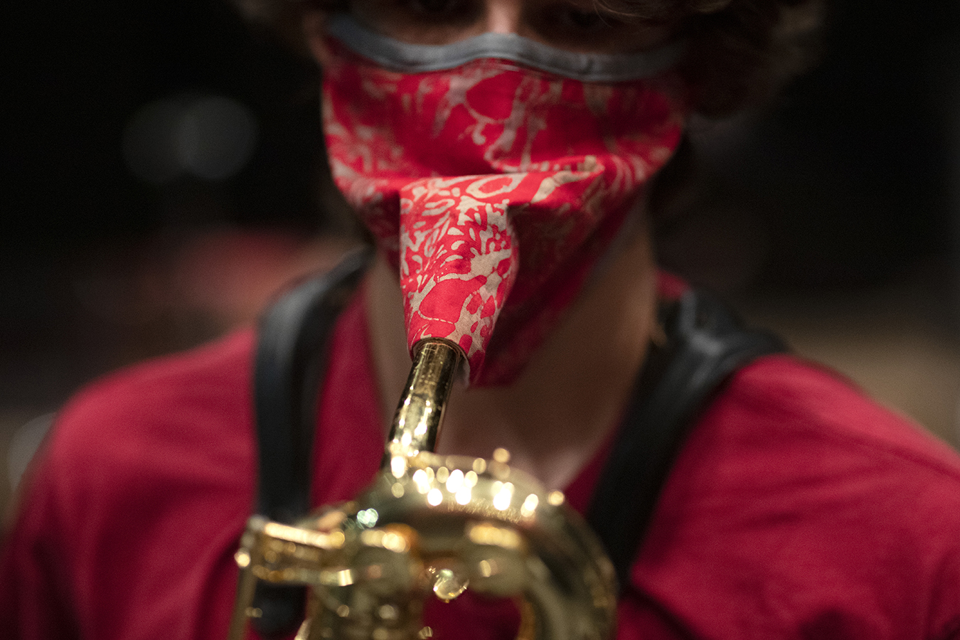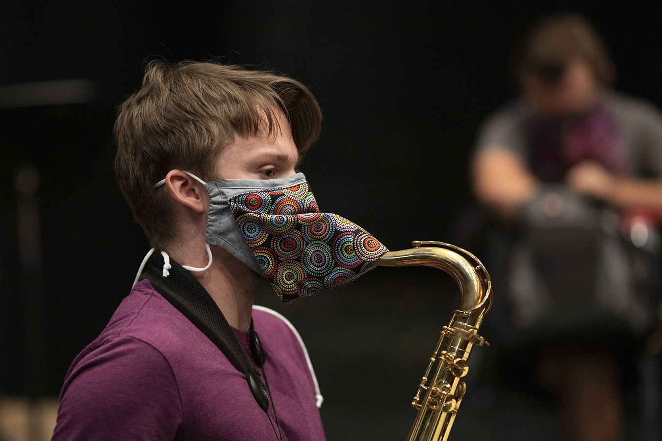 His worries evaporated when he arrived on campus and discovered that music professor Tom Walsh had invented a special mask with a hole and a protective flap to allow musicians to play while masked.