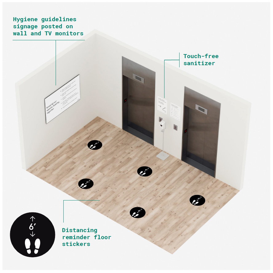 The Langham, a luxury hotel occupying the building’s first 13 floors, will place a sign with graphics in the elevator foyer to encourage social distancing, emailed spokesperson Deepika Sarma. Hotel staffers are looking into possible decals for the floors of the elevators indicating where to stand, and requiring riders to wear masks.