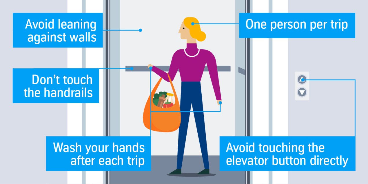 After all, most elevators are inherently cramped, enclosed spaces that can barely fit two people safely spaced 6 feet apart, much less the dozen or more that elevators in commercial and residential buildings were designed to hold. They’re a minefield of buttons and surfaces tempting to touch. Air circulation is limited to what a few vents and the opening doors can manage. Plus, they’re usually mobbed during the morning, lunchtime and evening rushes.