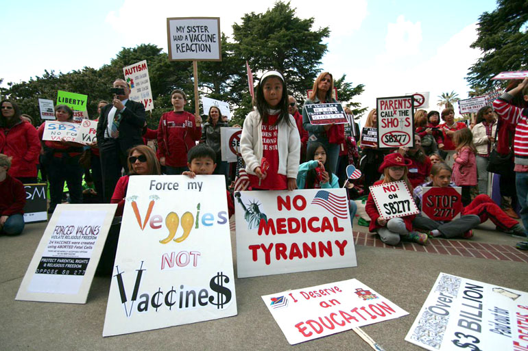 Vaccine opponents, who have been relatively quiet during the measles outbreak, turned out in force. They wore American flags, and one child held a sign that said, “Force my veggies, not vaccines.” The opponents say eliminating California’s current exemption that allows parents to refuse vaccinations for their children based on personal beliefs will threaten their ability to do what’s right for their kids.