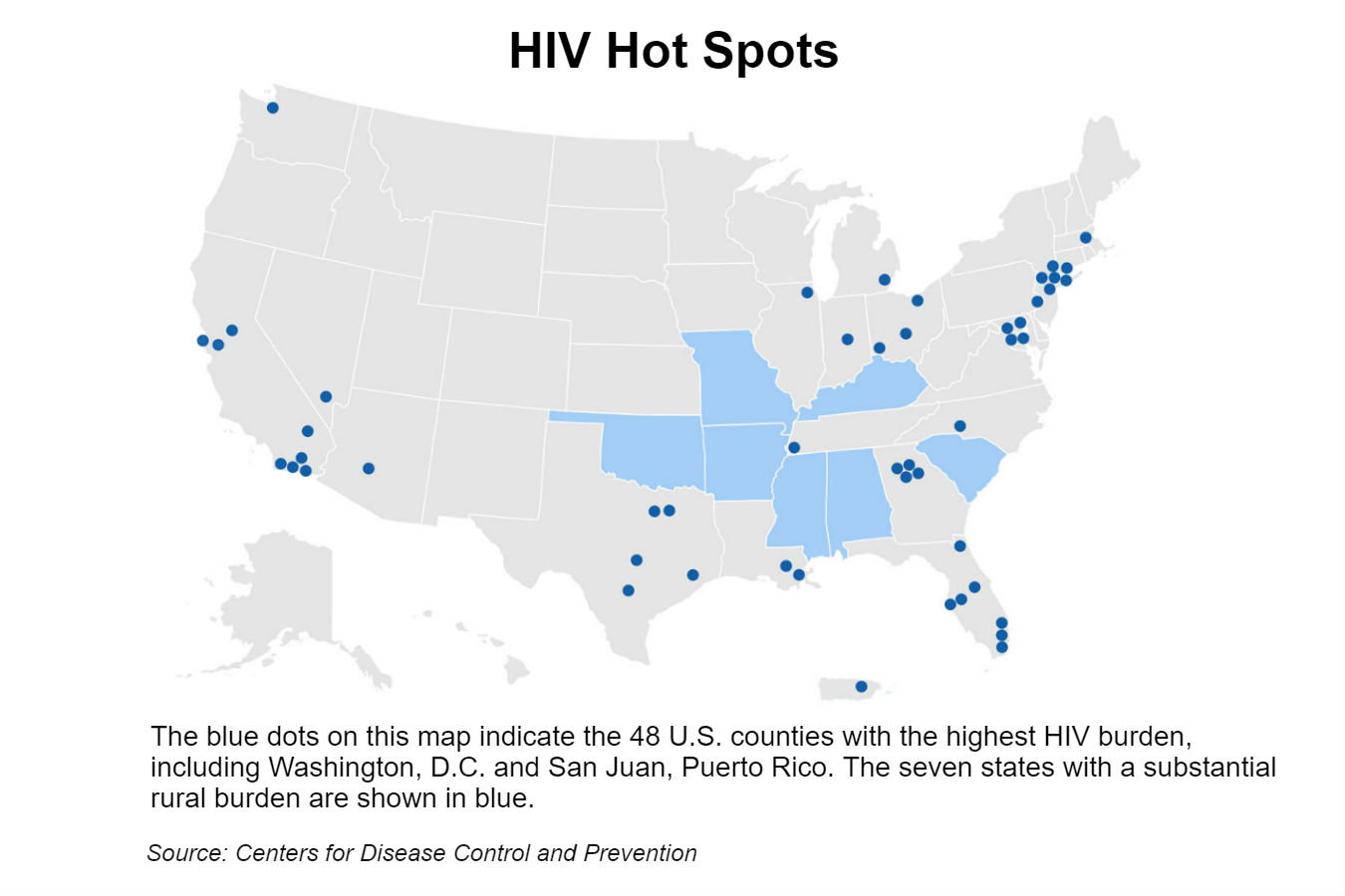 HHS said it will focus its efforts on the heart of the epidemic: 48 counties across 19 states; the District of Columbia; San Juan, Puerto Rico; and rural areas in seven states, many of which are in the South.