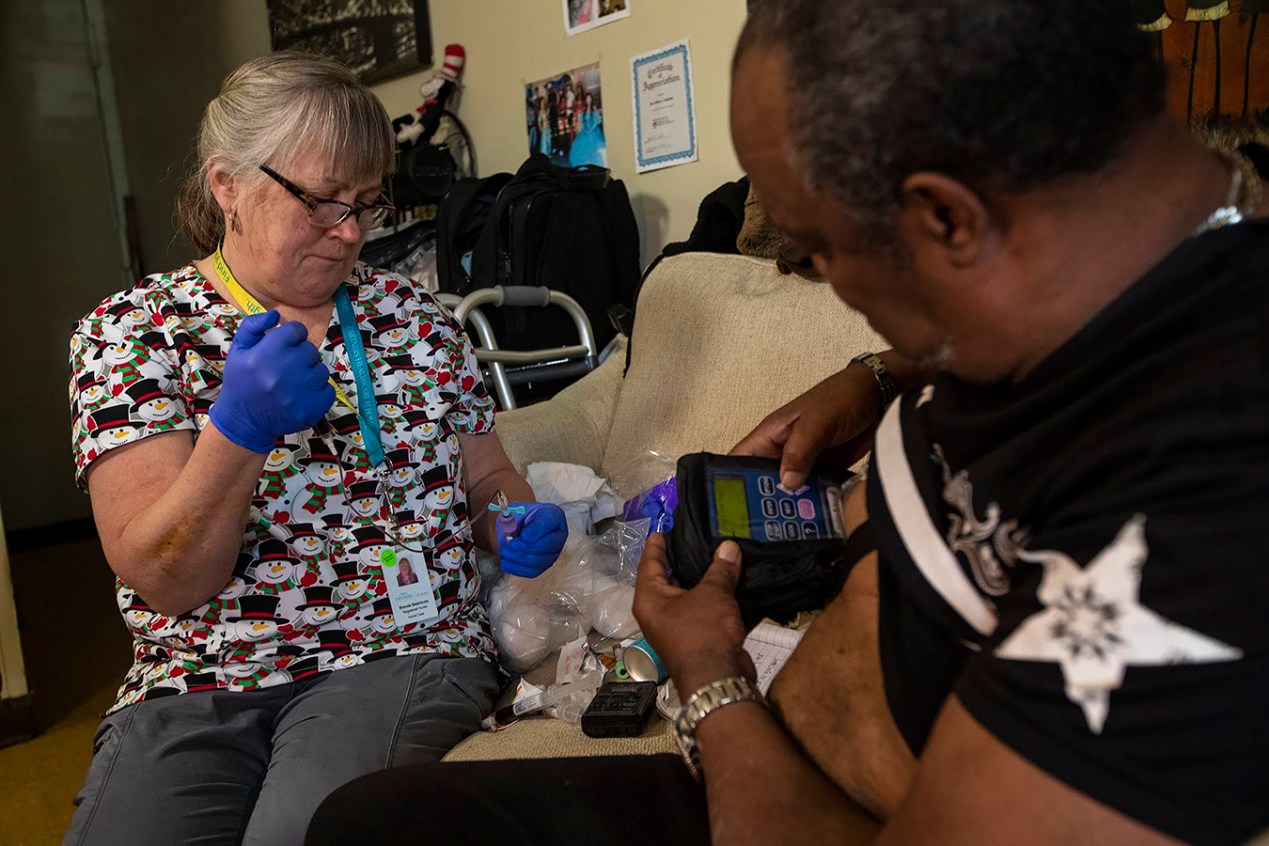 Brenda Mastricola is his visiting nurse. After she arrives at Jackson’s home in Boston, she joins him on the couch and starts by taking his blood pressure. Then she changes the bandages on Jackson’s right foot. His big toe was amputated at Brigham and Women’s Hospital in November. A bacterial infection, osteomyelitis, had destroyed the bone.