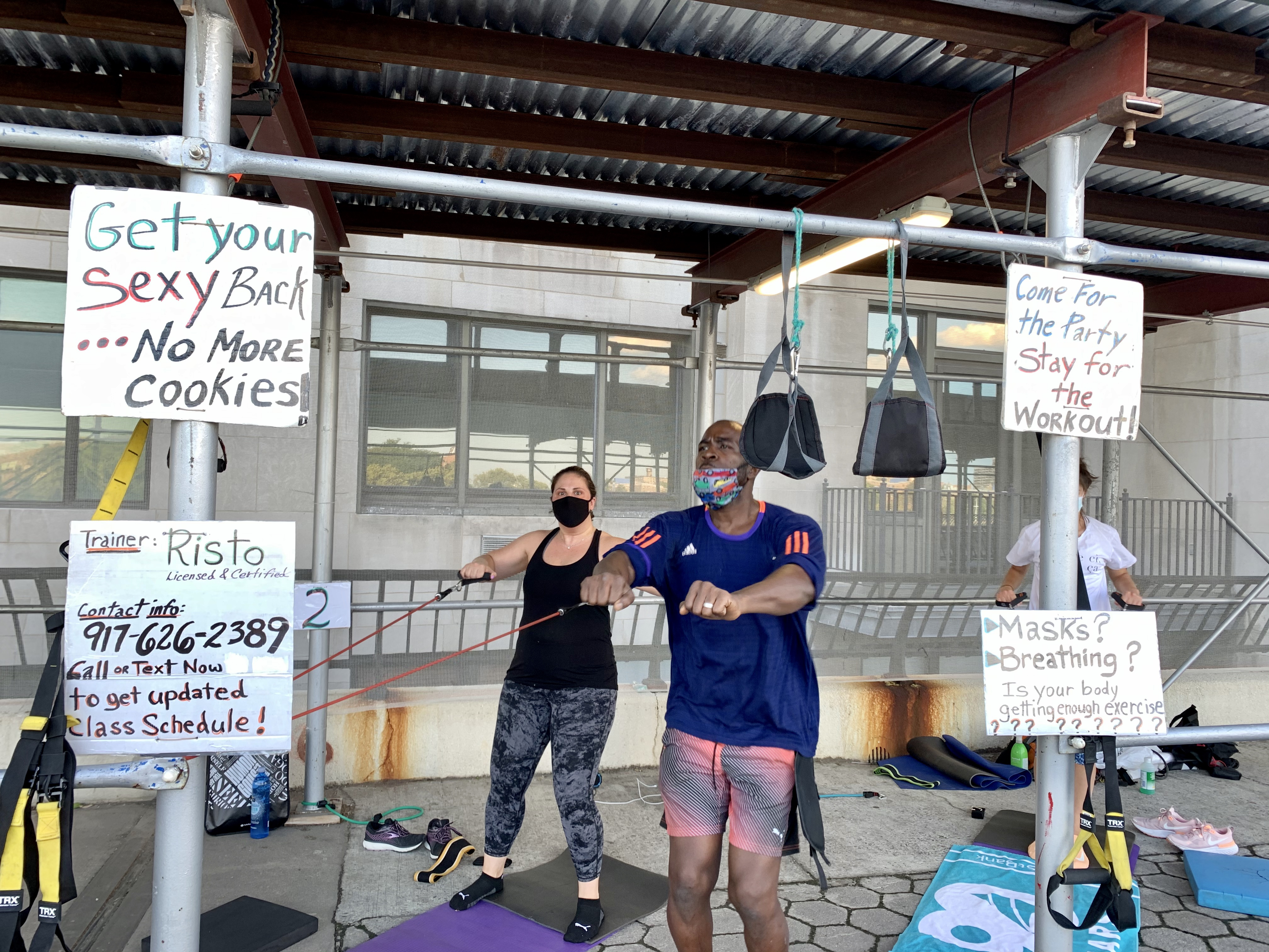 His stress slowly improved as he worked with another instructor to teach small classes in the park. He’s enjoying the fresh air and open space, though he’s careful not to push clients too hard in the heat.