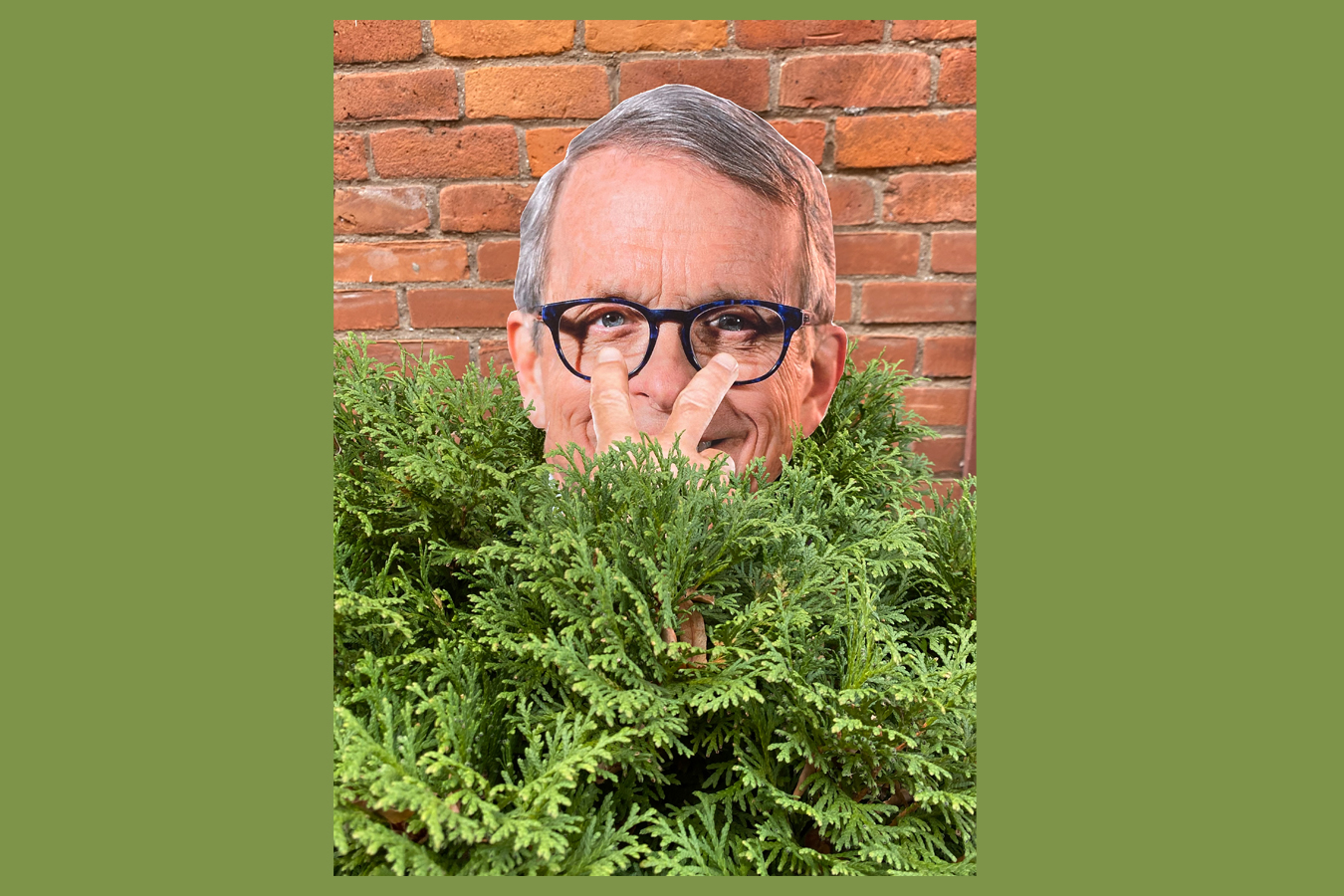 Shanteau, a graphic artist, was hoping to give a few friends a little lift in the face of the worsening health crisis by taking pictures of his “DeWine Is Watching” prop peering around corners, over fences and from bushes.