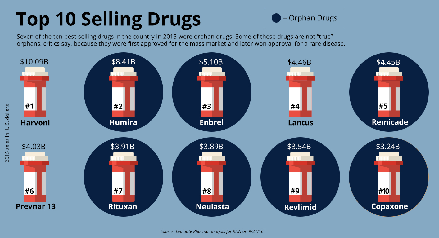 Orphan drugs now account for seven of the 10 top-selling drugs of any kind, ranked by annual sales, according to EvaluatePharma.