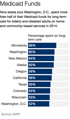 The report found strikingly wide variances in the share of state Medicaid spending for long-term care directed to home- and community-based services for elderly and disabled adults in 2014, the latest year for data covering all states. Minnesota, the top-ranked state, spent about 69 percent, but Alabama, ranked last, spent less than 14 percent.